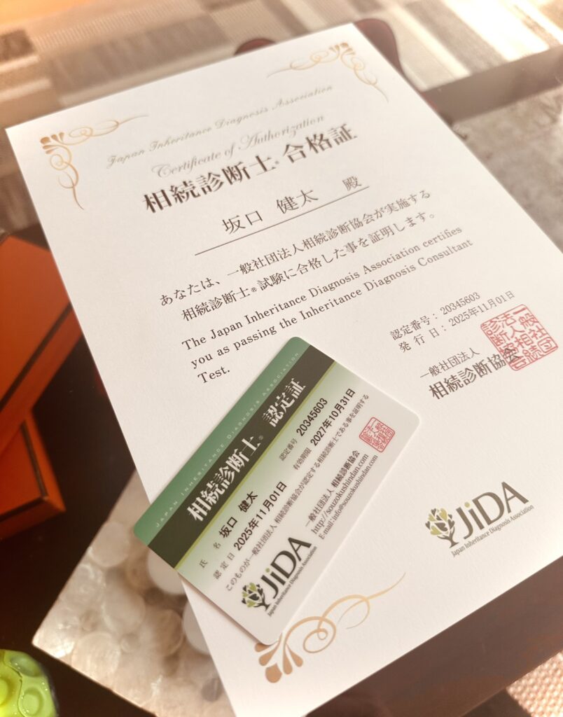 この度、相続診断士の資格を取得しました。写真は、試験合格の証明書と認定カード。自分の名前がそこに刻まれているのを見た瞬間、胸の中で静かにスイッチが入りました。相続は、人生の中でそう多くは起こらない出来事です。だからこそ、いざその時が来た時に、「誰に相談したらいいのかわからない」という不安の声を、これまで仕事や日常の中で何度も耳にしてきました。